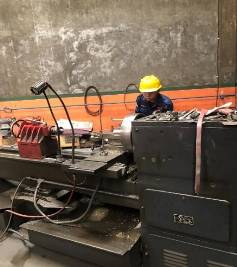 Proses berikutnya adalah drilling dan tapping untuk membuat lubang ulir M16×50 pada kedua ujung shaft. Lubang ulir ini berfungsi sebagai tempat pemasangan baut untuk menarik shaft keluar dari bearing atau sebagai titik pengait saat perakitan. Pada bagian tengah shaft, terdapat segmen Ø60 mm yang diberi ulir khusus KM12 (M60×2) dengan slot 8×2,5 mm di atasnya menggunakan mesin milling.