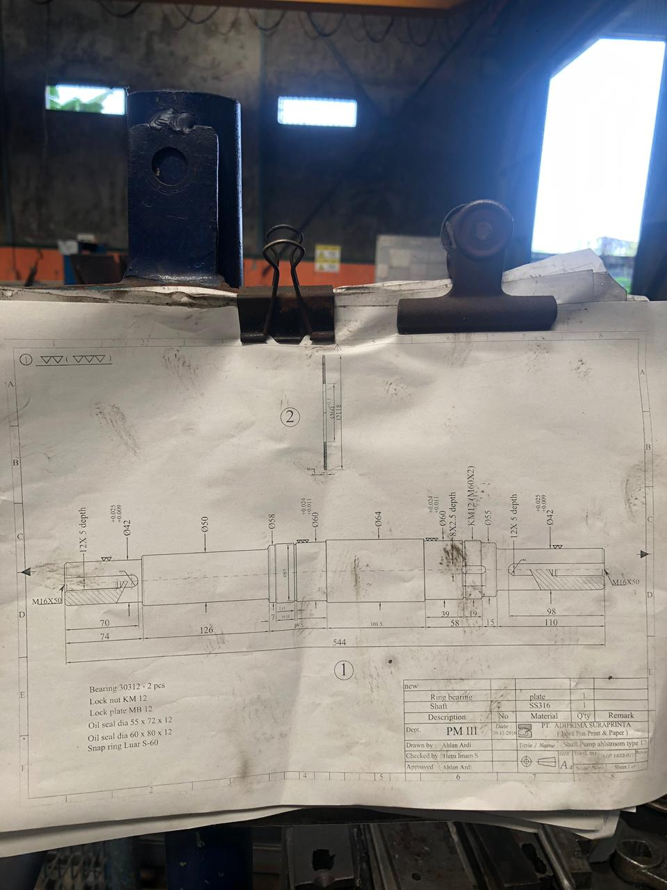 Langkah pertama dalam proses pembuatan adalah memahami gambar kerja shaft pump Ahlstroom Type 17. Gambar kerja ini menjadi acuan utama yang memuat seluruh spesifikasi teknis, dimensi, toleransi, material, serta urutan proses yang harus dilakukan. Dengan memahami gambar kerja secara menyeluruh, operator dapat menentukan strategi pemesinan yang efisien dan meminimalkan kesalahan dalam proses produksi.